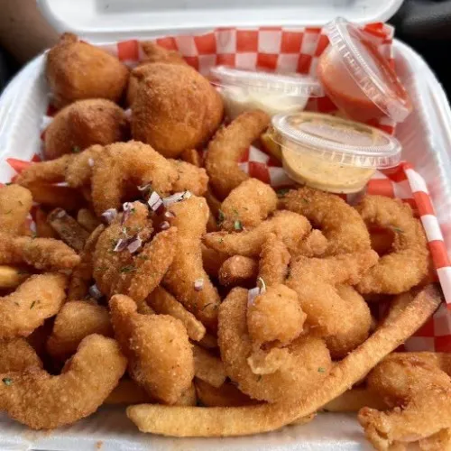 Popcorn shrimp, French fries, 3 hush puppies, and side of cole slaw